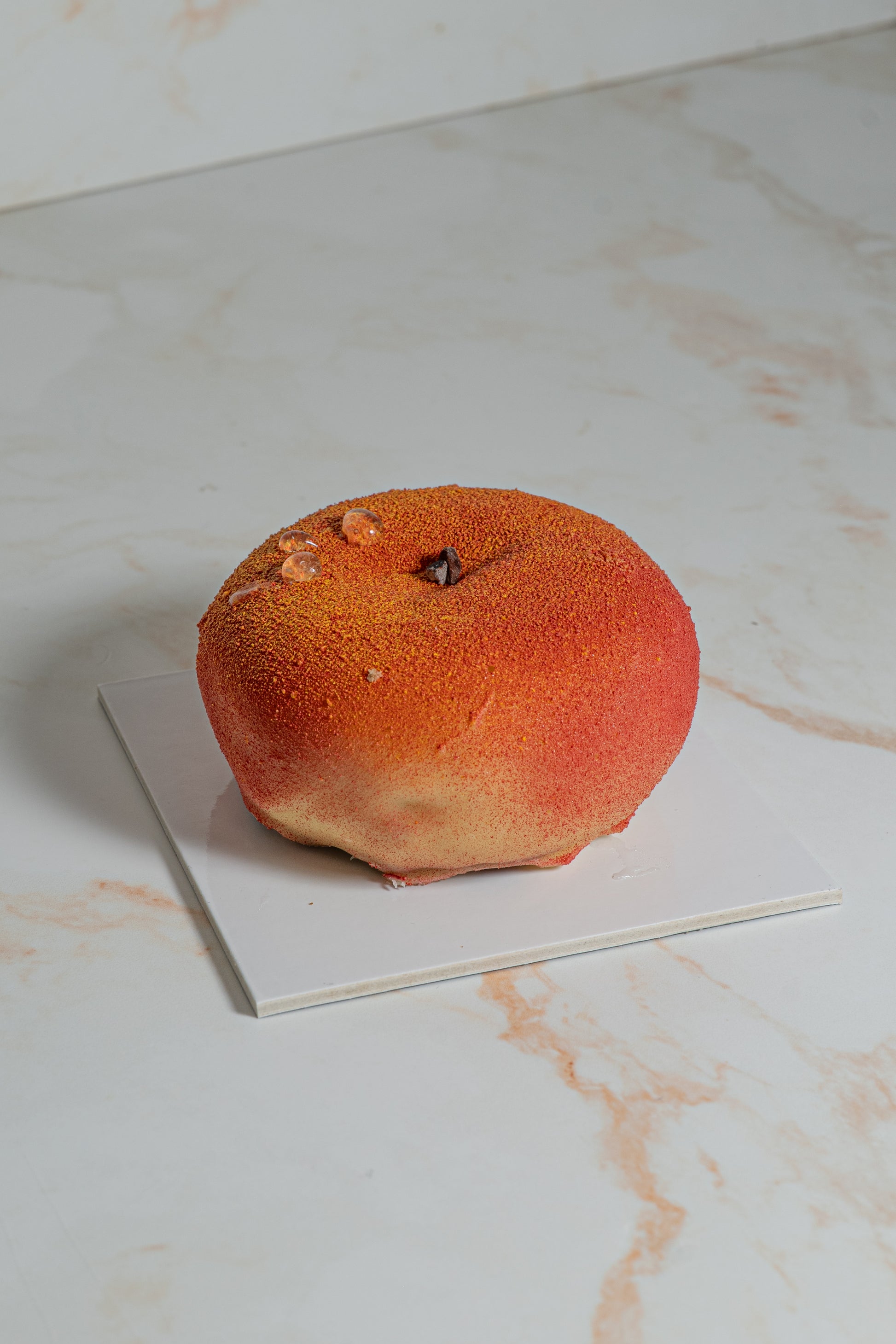 Ganache montée vanille verveine, biscuit madeleine, gel pêche, croustillant feuilletine, fine couche de chocolat blanc.